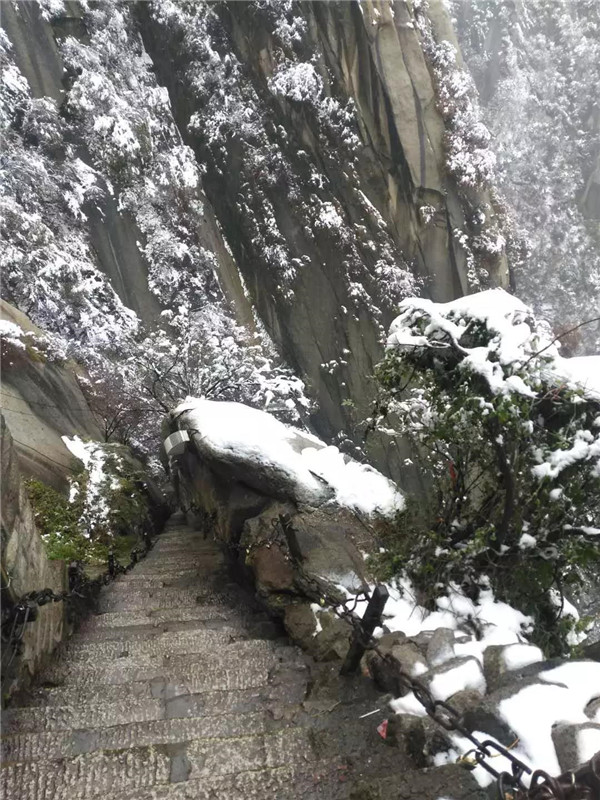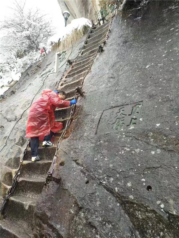 大概到了千尺幢,路就非常陡峭了,幾乎垂直攀登。戴上手套,登山杖收進(jìn)背包,抓緊鐵鏈子,懸崖外寒風(fēng)呼嘯,雨雪交加,絕壁上的古松巍然屹立,驢友相互鼓勵(lì)有說(shuō)有笑,天冷,但心是熱的。