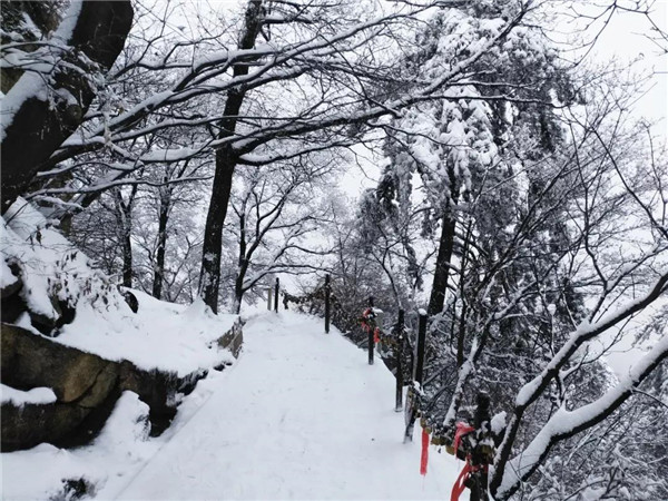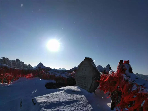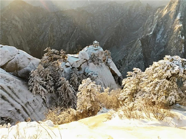 過(guò)后,又看到了下棋亭,長(zhǎng)空棧道,華山松,西峰,南峰。想到金庸先生,想到“華山論劍”,“飛雪連天射白鹿,笑書(shū)神俠倚碧鴛”,伴隨了中國(guó)幾代人的武俠情懷。這里,金色的陽(yáng)光,湛藍(lán)的天空,皚皚白雪;站在南峰仰天池上,左手秦嶺群山,右手八百里秦川,這就是華山之巔!