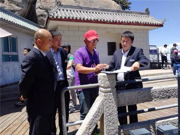 其實(shí),雷科峰平時(shí)對(duì)大家要求挺嚴(yán)的,職工背后議論說(shuō)雷科峰有一種軍人作風(fēng),凌厲、硬氣,大家跟上他干事活多還辛苦。印象最深的是那一次美化南天門“三間房一頁(yè)瓦”附近的臺(tái)地??油莶黄降呐_(tái)地上原來(lái)蒙著一堆土,晴天一層灰,雨天滿地泥,冬天雪泥一凍一消,平臺(tái)就成了沼澤,不說(shuō)過(guò)來(lái)過(guò)去行走不便,看起來(lái)也讓人不舒服,游客常常一不小心就濺得滿身的泥水,很掃興,雷科峰下決心美化平臺(tái)。美化平臺(tái)所用的沙子、石子、水泥要到二三里路遠(yuǎn)的溝底去背。從山頂?shù)綔系?,一路上全是立坡陡崖,雷科峰領(lǐng)著十幾名職工利用六天的工余時(shí)間,硬是把近二十噸的沙石背了上來(lái)。背料過(guò)程中,有的職工肩膀磨破了,有的雙腿像篩糠一樣抖個(gè)不停,許多職工中途不敢蹴下來(lái)休息,怕一蹴下就再也站不起來(lái)了,歇息時(shí)把沙袋子擱在路邊的石坎上,人站著緩口氣……一個(gè)個(gè)汗流浹背,氣喘吁吁。