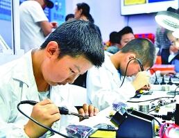 2018世界機器人大會上,小學(xué)生在焊接用于編程的模塊。新華社發(fā)