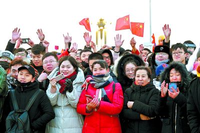 “我愛你祖國!”1月1日7時36分,當鮮艷的五星紅旗高高飄揚在天安門廣場,兩萬羽和平鴿騰空而起時,在觀旗的7.5萬群眾中爆發(fā)出熱烈的歡呼聲。