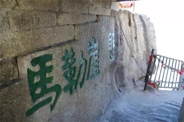 華山長空棧道上下皆是懸崖絕壁,鐵索橫懸,由條石搭成尺許路面,下由石柱固定。由于棧道險峻,故當(dāng)?shù)厝擞?ldquo;小心九厘三分,要尋尸首,洛南商州”之說。這里只是探險之道,并非登山必由之路,膽小人就在升表臺看看也就行了。所以在長空棧道的入口處,就有這樣一塊石刻,上邊刻著“懸崖勒馬”四個大字。懸崖勒馬的字面意思就是說在高高的山崖邊上勒住馬。比喻到了危險的邊緣及時清醒回頭。面對長空棧道這樣險峻的地勢,游人確實要比正常情況下更加清醒。
