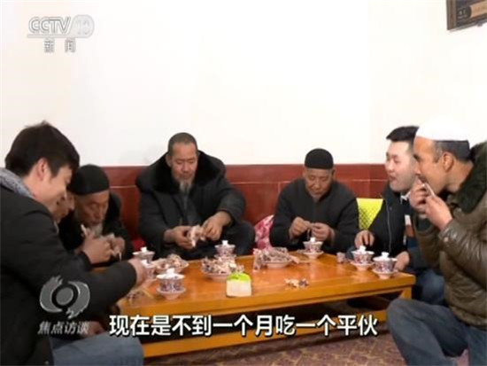 吃平伙是東鄉(xiāng)族老百姓的一個傳統(tǒng),就是大家買一只羊,平攤價格以后搭伙吃羊肉。過去,只有家里娶媳婦、蓋房子這樣的大事,才能吃個平伙。現(xiàn)在生活好了,家里請客的時候也吃平伙,今天,馬麥志要請客,不用大家出份子錢了。他說大兒子在外面打工,自己在干清潔工,媳婦在車間里面炸油馃馃,收入應(yīng)該有3萬多元。