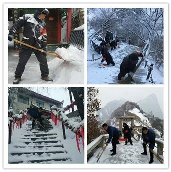 2月9日晚,一場(chǎng)大雪突降華山景區(qū),當(dāng)工作人員與游客一起沉浸在新年的喜悅氛圍時(shí),華山景區(qū)悄然鋪上了一層厚厚的積雪。2月10日早6時(shí),華旅集團(tuán)通過(guò)多渠道號(hào)召全體員工在各自崗位迅速開(kāi)展掃雪除冰工作。雪情就是命令,來(lái)不及欣賞新年首場(chǎng)雪景,廣大員工扛起掃把鐵鍬等掃雪工具,第一時(shí)間奔赴“戰(zhàn)場(chǎng)”,全力確保景區(qū)恢復(fù)運(yùn)營(yíng)。