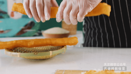 7.老油條從中間掰開,疊放至大根上。(油條一般用涼透了又帶有點(diǎn)韌性的,如果喜歡吃酥脆的話,可要用上熱騰騰的嫩油條。)