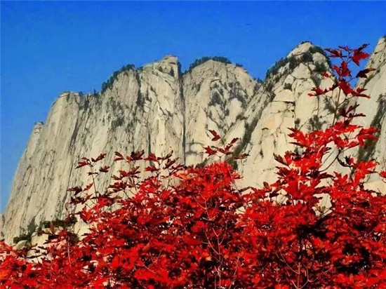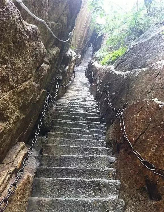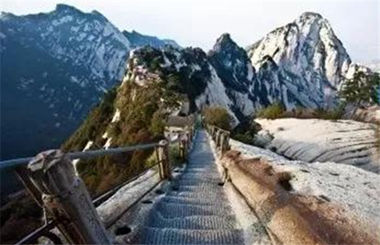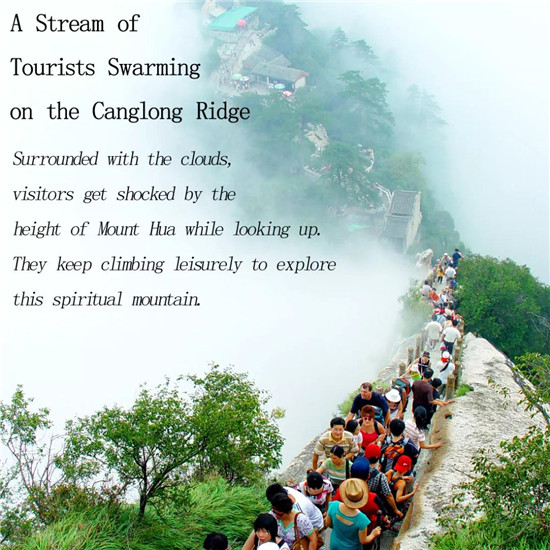 這是一個(gè)溫暖的美麗秋天,華山壯觀的峭壁在陽光下閃閃發(fā)亮,稀有樹木炫耀著多彩的秋葉,遠(yuǎn)方跳躍的瀑布吸引著游客的眼球,奇形怪狀的點(diǎn)點(diǎn)白云在腳下緩緩流動。我和我的朋友開始了一場艱苦的旅行,一起攀登6,600多級鑿在巖石上的臺階,目標(biāo)是海拔2154.9米南峰之巔祭祀華山神的道觀。