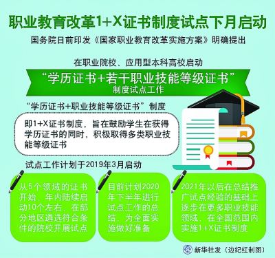 “職教20條”提出,從2019年開始,在職業(yè)院校、應用型本科高校啟動“學歷證書+若干職業(yè)技能等級證書”制度試點(以下稱1+X證書制度試點)工作。試點工作要進一步發(fā)揮好學歷證書作用,夯實學生可持續(xù)發(fā)展基礎,鼓勵職業(yè)院校學生在獲得學歷證書的同時,積極取得多類職業(yè)技能等級證書,提高就業(yè)創(chuàng)業(yè)本領,緩解結構性就業(yè)矛盾。