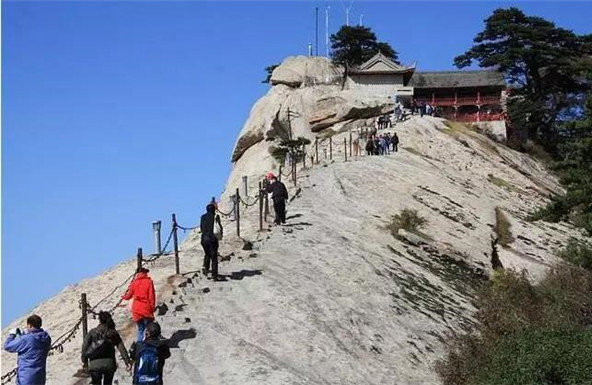 而被大家熟悉的長空棧道,則位于華山南峰東側(cè)山腰,是華山派第一代宗師元代高道賀志真為遠(yuǎn)離塵世靜修成仙,在萬仞絕壁上鑲嵌石釘搭木椽而筑。去過華山的朋友,大部分肯定體驗過華山長空棧道,在千仞絕壁之上,左邊是大山,而右邊就是萬丈深淵,想要通過僅僅是靠著腳下這一寬30多公分的棧道,周圍無任何欄桿,但令人興慶的是,在崖上還有釘?shù)睦喂痰蔫F索可以抓住,讓探險者可以稍微放松一點(diǎn)心情。