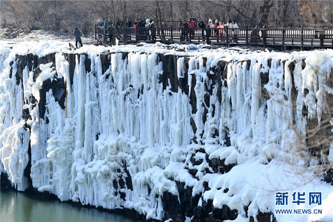 去冬今春以來,黑龍江省鏡泊湖的吊水樓冰瀑景色壯觀,吸引許多游人前來觀賞。 新華社記者 王建威 攝