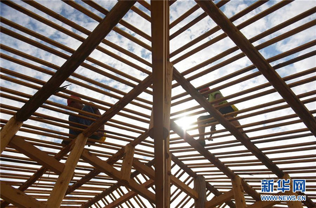 在湖北省宣恩縣曉關(guān)侗族鄉(xiāng),工人在建設吊腳樓(2018年7月26日攝)。2018年,當?shù)卣_始修建6座新的侗寨吊腳樓,為符合易地搬遷政策的貧困戶實施搬遷。新華社發(fā)(王俊 攝)