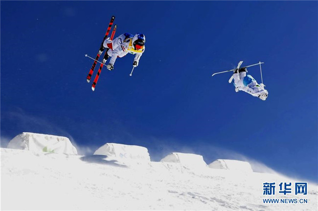 運動員在河北張家口市崇禮區(qū)太舞滑雪場參加自由式滑雪雪上技巧世界杯比賽(2018年12月16日攝)。新華社記者 楊世堯 攝