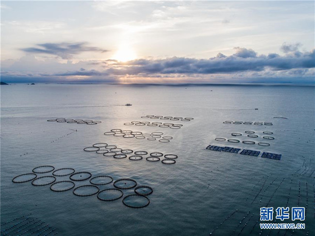 夕陽映照下的浙江省溫州市平陽縣南麂島馬祖岙海域,圓形的都是大黃魚養(yǎng)殖網(wǎng)箱(2018年8月18日無人機拍攝)。新華社記者 徐昱 攝