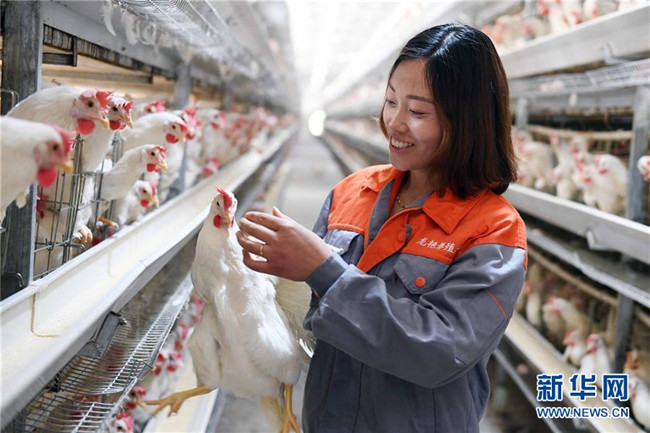 在云南省鎮(zhèn)雄縣五德鎮(zhèn)渡船壩社區(qū),返鄉(xiāng)創(chuàng)業(yè)的劉艷在養(yǎng)殖場(chǎng)查看優(yōu)質(zhì)蛋雞(2018年6月4日攝)。新華社記者 楊宗友 攝