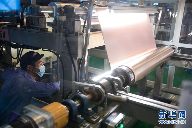 在安徽省銅陵市華創(chuàng)新材料有限公司生產(chǎn)車間,一名員工在監(jiān)測(cè)鋰電銅箔生產(chǎn)過程(2018年8月8日攝)。新華社記者 金立旺 攝