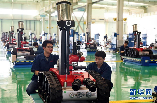 2018年3月30日,員工在位于江西共青城的中信重工開誠智能裝備有限公司生產(chǎn)基地組裝防爆消防滅火偵察機器人。 新華社記者 宋振平 攝