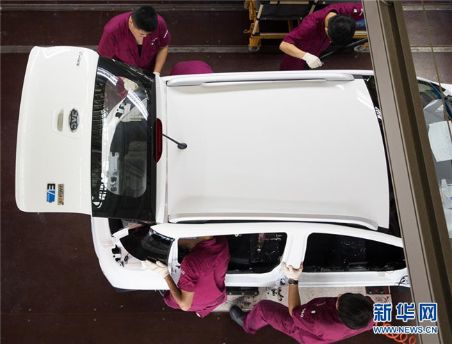 2018年8月7日,工人在安徽江淮汽車集團股份有限公司安慶分公司新能源汽車總裝生產(chǎn)線上安裝純電動車。 新華社記者 金立旺 攝