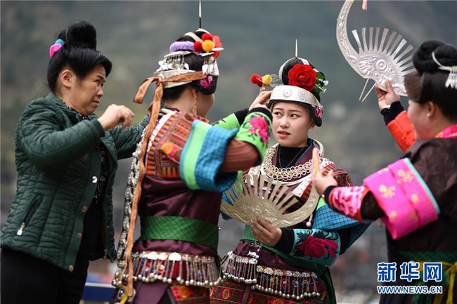 3月16日,在丹寨縣南皋鄉(xiāng)清江村,苗族姑娘為翻鼓節(jié)悉心打扮。 當(dāng)日,貴州省黔東南苗族侗族自治州丹寨縣南皋鄉(xiāng)清江村清江村舉行翻鼓節(jié)。翻鼓節(jié)是當(dāng)?shù)孛缱宕迕裼哟焊絹淼拿袼坠?jié)日,至今已有近600年歷史,每年農(nóng)歷二月舉行。 新華社記者 楊文斌 攝