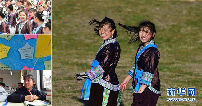 這是一張拼版照片:右圖為韋迎春(右)和同學(xué)在一起(2月6日攝);左上圖為韋迎春(中)在家鄉(xiāng)的“打同年”活動中(2月7日攝);左中圖為韋迎春在小卡紙上寫下的夢想(3月22日攝);左下圖為韋迎春在課堂上聽課(3月22日攝)。韋迎春來自融水苗族自治縣桿洞鄉(xiāng)堯告村,目前在融水民族高中讀高一。 新華社記者 黃孝邦 攝