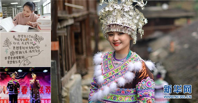 這是一張拼版照片:右圖為楊琳詩瑤(2月16日新華社記者黃孝邦攝);左上圖為楊琳詩瑤在學(xué)校圖書館里學(xué)習(xí)(3月23日攝,楊琳詩瑤供圖);左中圖為楊琳詩瑤在紙上寫下的夢想(3月23日攝,楊琳詩瑤供圖);左下圖為楊琳詩瑤(右)在家鄉(xiāng)主持苗寨的春節(jié)聯(lián)歡晚會(2月10日新華社記者黃孝邦攝)。楊琳詩瑤是融水苗族自治縣桿洞鄉(xiāng)桿洞村的苗族姑娘,去年以優(yōu)異成績考上廣西民族大學(xué)。 新華社發(fā)