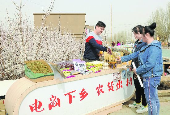 3月23日,新疆托克遜縣夏鄉(xiāng)南湖村電子商務(wù)服務(wù)點的工作人員在為游客介紹當(dāng)?shù)氐奶厣r(nóng)產(chǎn)品。 近年來,托克遜縣通過構(gòu)建電子商務(wù)培訓(xùn)體系、農(nóng)產(chǎn)品營銷體系等,幫助當(dāng)?shù)剞r(nóng)民開設(shè)網(wǎng)店,尋找代銷產(chǎn)品、入駐網(wǎng)絡(luò)銷售平臺,引領(lǐng)農(nóng)民走上致富路。(秦梅花)