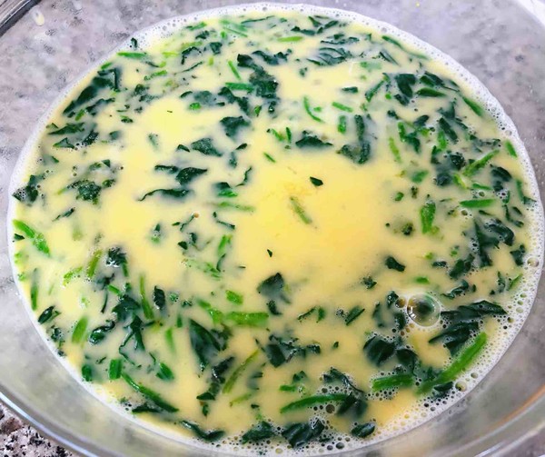 6.菠菜放入蛋液中再放入香油、鹽和味精攪拌均勻入味