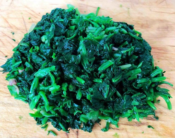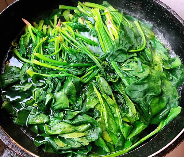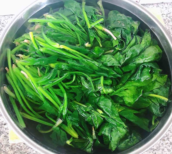 2.鍋中燒開水放入菠菜焯水至菠菜剛剛變色即可時(shí)間不可過長(zhǎng)