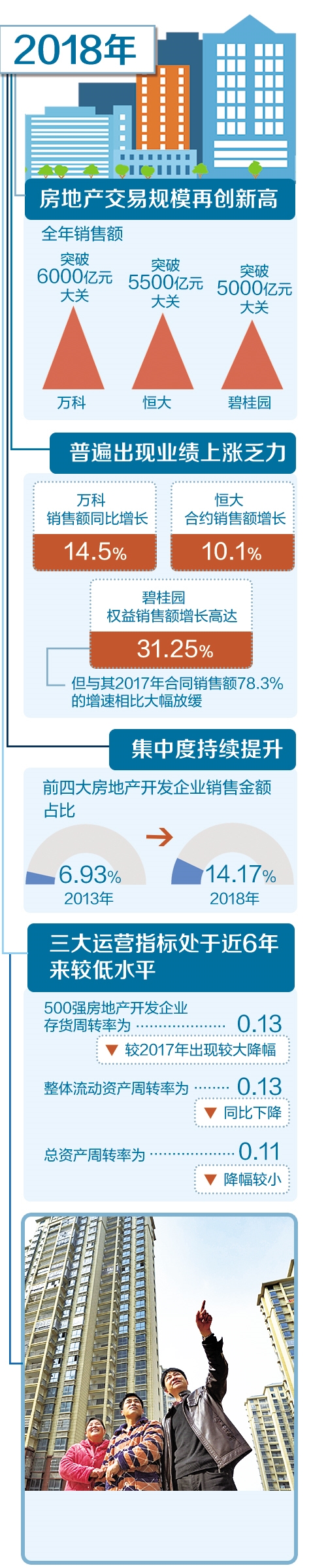 “活下去”。龍頭房企萬科在去年作出了房地產(chǎn)行業(yè)轉(zhuǎn)折已經(jīng)到來的判斷。雖然萬科發(fā)出的聲音略顯夸張,但隨著我國房地產(chǎn)調(diào)控長效機(jī)制不斷完善,房地產(chǎn)行業(yè)的“黃金時代”正在漸行漸遠(yuǎn)。近日密集發(fā)布的上市房企年報顯示,多數(shù)房企在營收、利潤方面業(yè)績理想,但銷售額增幅在逐步告別高增長,進(jìn)入中速增長。在行業(yè)集中度不斷提高、行業(yè)增速放緩的情況下,聚焦主業(yè)、精細(xì)化運(yùn)營、提升品質(zhì)、多元化布局成為各大房企角力的關(guān)鍵詞。