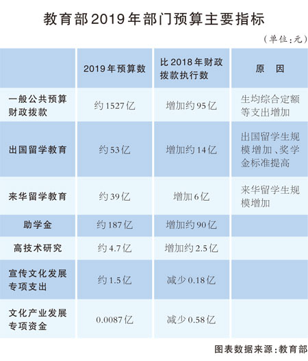 關(guān)于資金來源,教育部2019年部門預(yù)算顯示,2019年一般公共預(yù)算財政撥款約為1527億元,比上年執(zhí)行數(shù)增加約95億元。其主要原因為生均綜合定額、出國留學(xué)經(jīng)費(fèi)以及學(xué)生資助工作專項等支出增加。