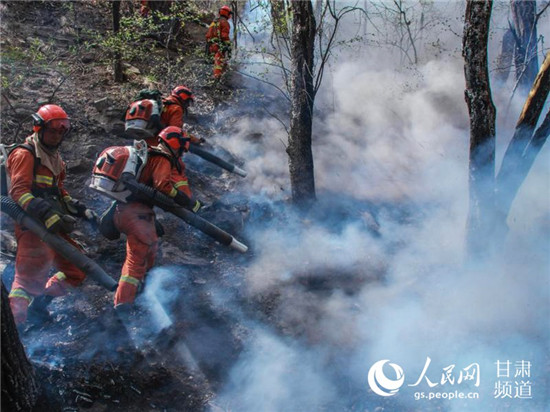 消防員到達(dá)火場(chǎng)后開始打火。(甘肅省森林消防總隊(duì)供圖)