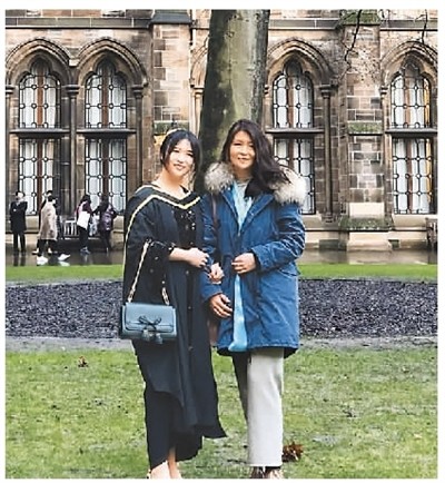 趙文琦身穿碩士服,與媽媽在英國(guó)校園中留影。