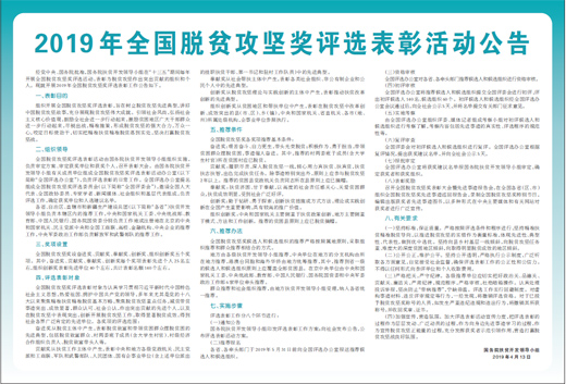 經(jīng)黨中央、國務(wù)院批準(zhǔn),國務(wù)院扶貧開發(fā)領(lǐng)導(dǎo)小組在“十三五”期間每年開展全國脫貧攻堅獎評選活動,表彰為脫貧攻堅作出突出貢獻(xiàn)的組織和個人?,F(xiàn)就開展2019年全國脫貧攻堅獎評選表彰工作公告如下。