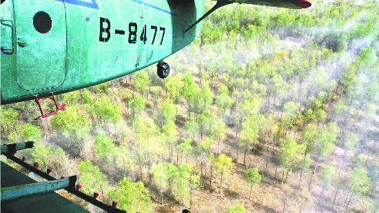 4月14日,一架農用飛機在第一師10團防風林帶上空噴灑殺蟲劑。自4月上旬以來,兵團對葉爾羌河、塔里木河流域的第一師、第二師和第三師的35萬畝野生胡楊林和人工林實施飛防,有效控制食葉害蟲對野生胡楊林和人工林的危害。王志清 攝