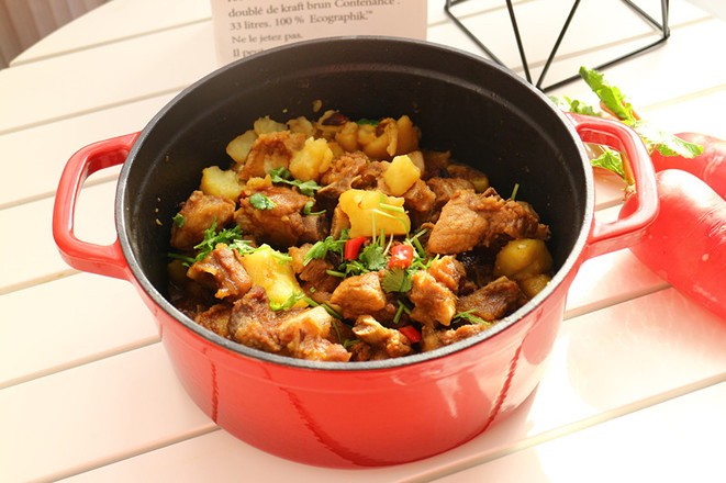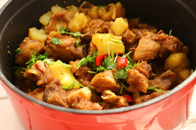10.撒上少許的辣椒,香菜點(diǎn)綴提味,香噴噴的排骨土豆就做好了,雖然是家常菜,但是做出來(lái)一樣特別的好吃。