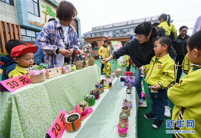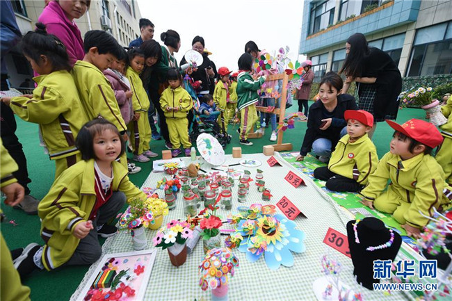當日,浙江省長興縣畫溪街道包橋中心幼兒園舉辦校園義賣節(jié)。10多個攤位上擺放著家長和孩子一起用廢舊的玻璃瓶、雪糕棍、紙盒、紐扣等廢舊材料制作而成的小木屋、迷你小盆栽、紐扣花束、風車等手工作品,孩子們以班級為單位進行手工作品義賣,所得款項將全部用于社區(qū)公益環(huán)?;顒?。主辦方介紹,希望通過這樣的活動,倡導廢物利用和綠色低碳的生活理念。