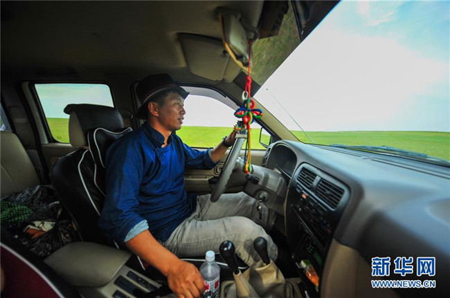 2017年7月17日,內(nèi)蒙古自治區(qū)新巴爾虎右旗克爾倫蘇木芒來嘎查黨支部書記米吉格駕車行駛在牧場上。新華社記者 連振 攝
