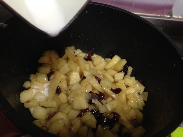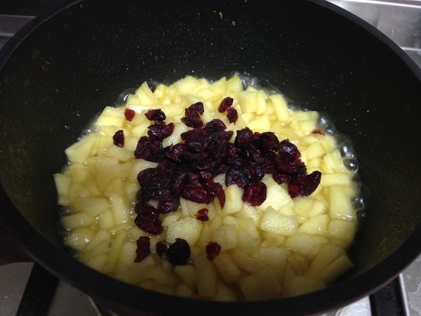 5.煮至蘋果軟蔫半透明時(shí)倒入蔓越莓干拌勻