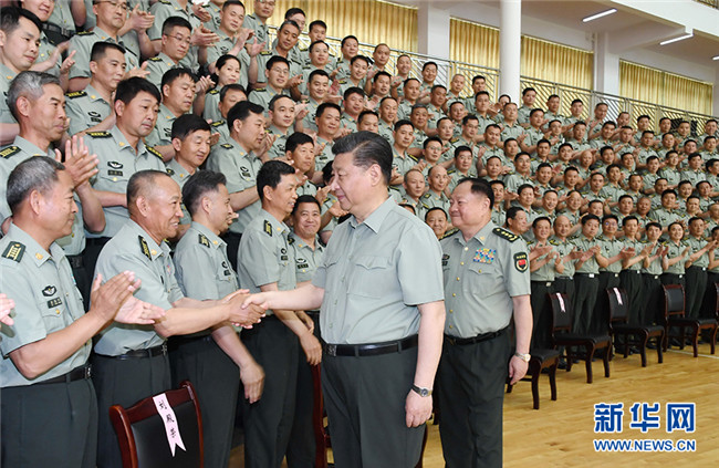5月21日,中共中央總書記、國家主席、中央軍委主席習近平到陸軍步兵學院視察。這是習近平親切接見駐江西部隊副師職以上領導干部和建制團級單位主官、陸軍步兵學院本部正團職以上干部和石家莊校區(qū)主官、專家教授代表。新華社記者 李剛 攝
