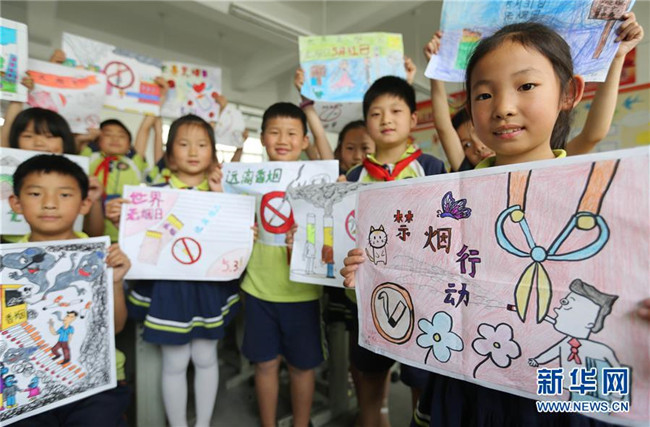 5月30日,臨沂市沂南縣第五實(shí)驗(yàn)小學(xué)的學(xué)生在展示繪制的無(wú)煙日手抄報(bào)。新華社發(fā)(王彥冰 攝)