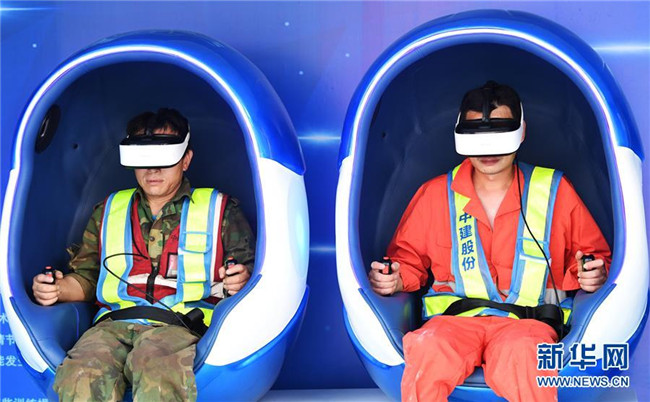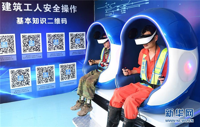 6月5日,重慶化龍橋超高層項目工人在VR安全體驗館內體驗“高空墜落”。在VR安全體驗館,工人們可通過VR游戲的方式親身體驗高空墜落、消防事故處置等項目,了解施工過程中可能遇到的危險、困難以及解決方法。 新華社記者 王全超 攝