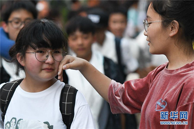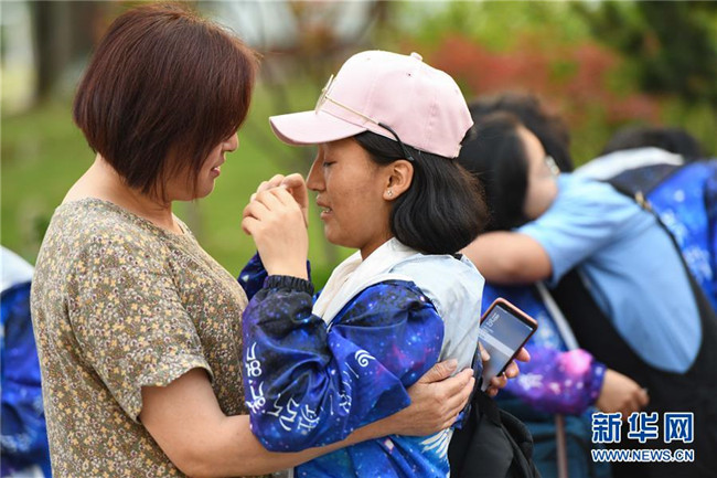 6月9日,合肥市第三十五中學(xué)西藏班的初三畢業(yè)生(右)與老師告別時(shí)落淚。