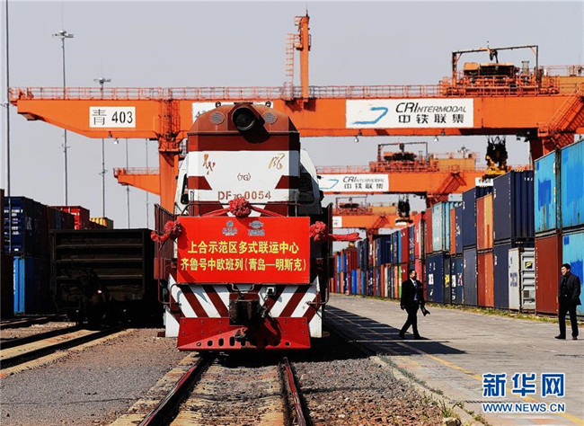 齊魯號(hào)中歐班列(青島—明斯克)從位于青島的中國(guó)—上海合作組織地方經(jīng)貿(mào)合作示范園發(fā)車(chē)(4月2日攝)。新華社記者 李紫恒 攝