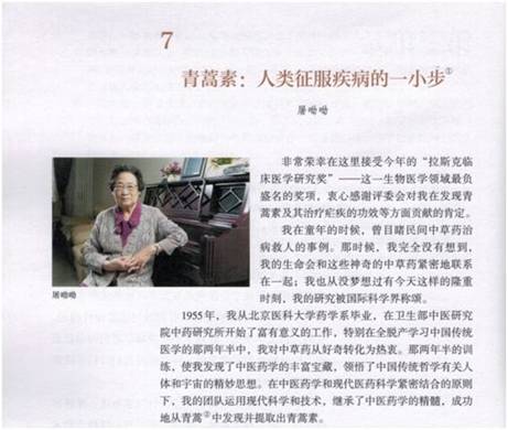據(jù)悉,今年秋季學(xué)期將開始推廣的統(tǒng)編高中語文教材已確定將屠呦呦2011年的獲獎(jiǎng)感言及同年發(fā)表的論文改編成課文《青蒿素:人類征服疾病的一小步》。人民教育出版社有關(guān)負(fù)責(zé)人介紹,屠呦呦在青年時(shí)期培養(yǎng)了對(duì)傳統(tǒng)醫(yī)藥學(xué)的熱愛,歷經(jīng)數(shù)年終于從古代藥典中獲得靈感,發(fā)現(xiàn)了青蒿素,并且至今仍在科學(xué)探索道路上孜孜以求。此次選錄這篇文章,旨在引導(dǎo)學(xué)生了解和尊重科學(xué),從屠呦呦的科研歷程中汲取力量。