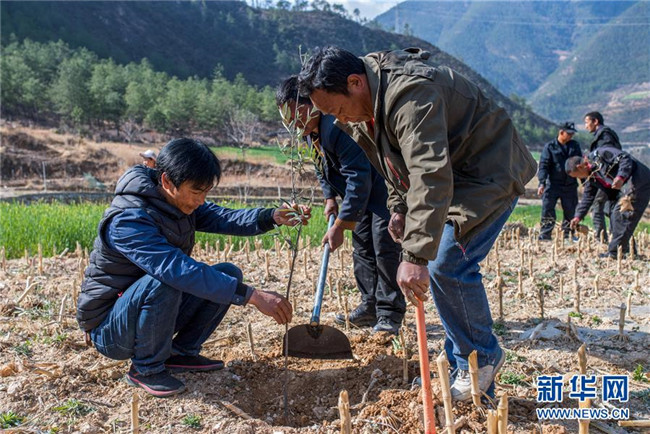 在云南香格里拉市五境鄉(xiāng),格茸(左)和“精準(zhǔn)扶貧感恩連”隊(duì)員在植樹(shù)(3月13日攝)。 新華社記者 胡超 攝