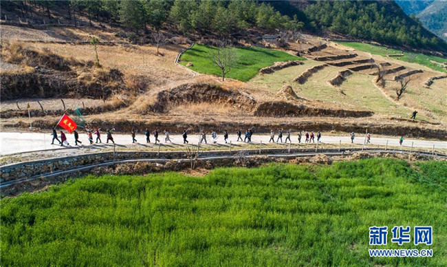 “精準(zhǔn)扶貧感恩連”在云南香格里拉市五境鄉(xiāng)開(kāi)展植樹(shù)活動(dòng)(3月13日無(wú)人機(jī)拍攝)。新華社記者 胡超 攝