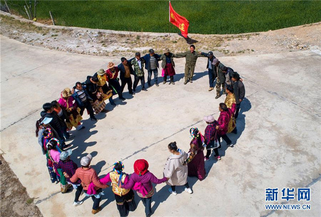 在云南香格里拉市五境鄉(xiāng),“精準(zhǔn)扶貧感恩連”隊(duì)員在跳鍋莊(3月13日無(wú)人機(jī)拍攝)。新華社記者 胡超 攝