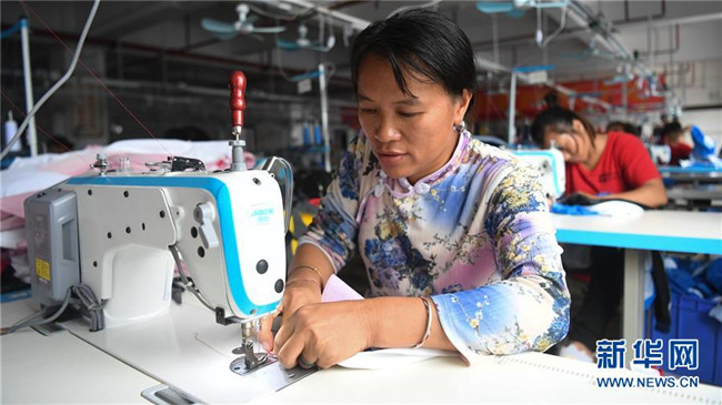 6月18日,在廣西隆林縣輕工業(yè)園區(qū)一家服裝廠,來自易地扶貧搬遷安置點的一名婦女在“扶貧車間”縫制衣服。