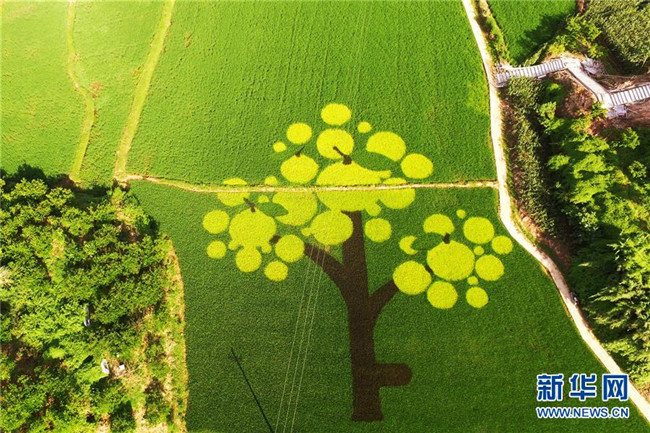 仲夏時(shí)節(jié),在重慶忠縣新立鎮(zhèn)中嶺社區(qū)出現(xiàn)水稻拼成的“笑臉”“橘子”等圖案,成為一道靚麗的鄉(xiāng)村田園風(fēng)景線。新華社記者 王全超 攝