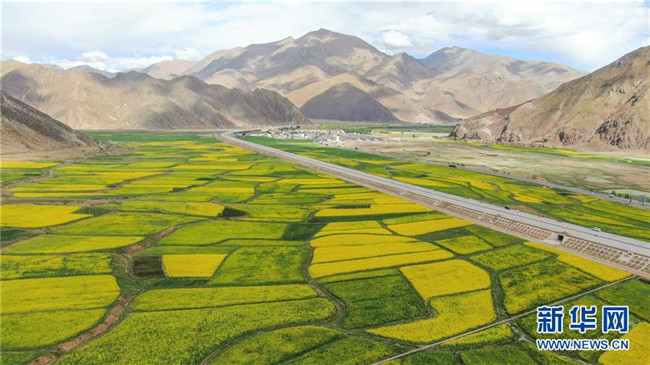 7月2日在拉薩市堆龍德慶區(qū)德慶鄉(xiāng)拍攝的油菜花田(無人機(jī)拍攝)。近日,西藏各地的油菜花盛開,呈現(xiàn)出生機(jī)勃勃的夏日美景。新華社記者晉美多吉攝