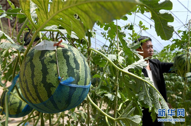 陜西省延安市安塞區(qū)化子坪鎮(zhèn)油坊坪村的村民王濤在西瓜大棚里修枝(4月23日攝)。新華社記者 劉瀟 攝