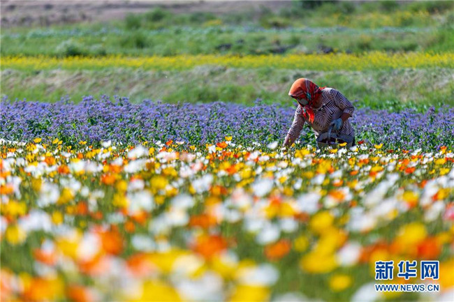 7月6日,甘肅省高臺縣新壩鎮(zhèn)紅沙河村村民在花田中勞作。 新華社發(fā)(鐘曉亮 攝)